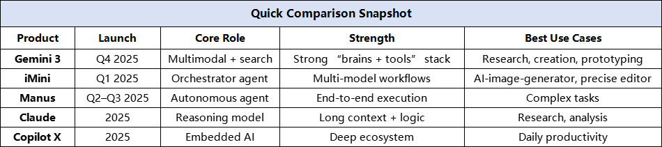 When you compare it with iMini and Manus, Gemini feels like the “brains + tools + data pipeline” foundation many other agents will build on.