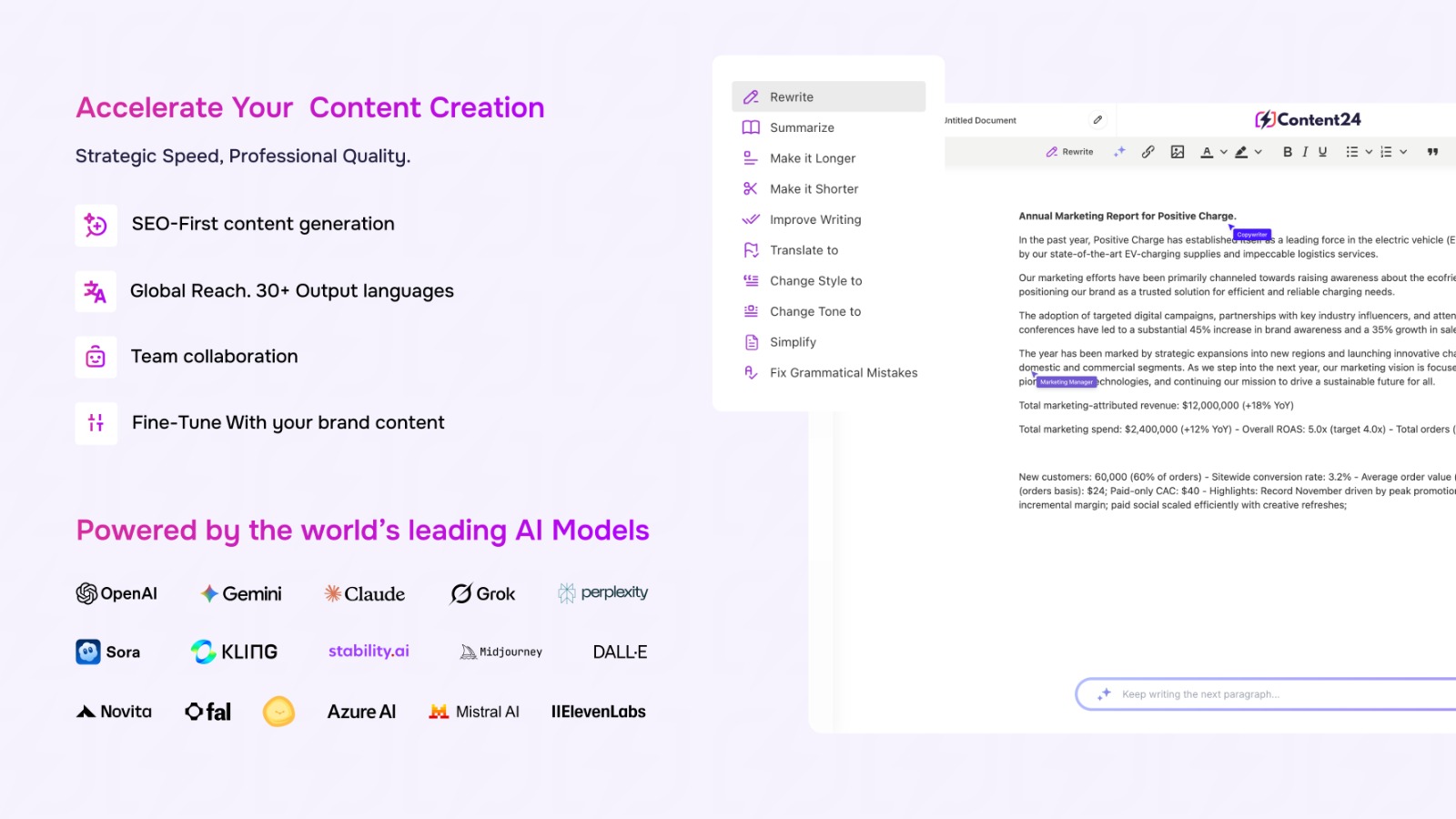 • Built-in SEO optimization and brand voice fine-tuning